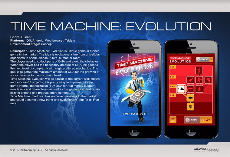 Time Machine: Evolution will be similar to the current well-known and successful projects, it is pretty easy to implement in the game internal monetization (buy DNA for real money to open new levels and characters), as well as the game has great possibility to expand and produce more content.
