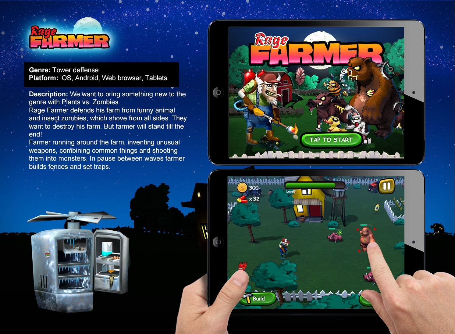 Farmer running around the farm, inventing unusual weapons, combining common things and shooting them into monsters. In pause between waves farmer builds fences and set traps.